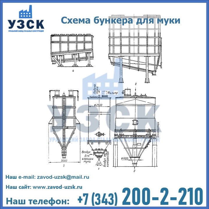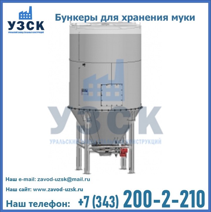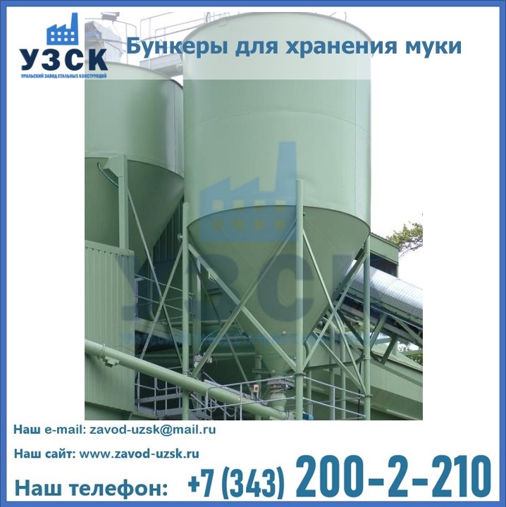 Завод «УЗСК» в Усть-каменогорске проектирует, производит и поставляет целевое оборудование, в том числе, бункеры для хранения муки и прочих сыпучих материалов.