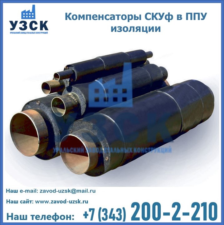 - 2СКУф ППУ: устройство с двумя и более компенсаторами (цифра в начале маркировки означает количество компенсаторов), с теплоизоляционным слоем в виде оцинкованного или полиэтиленового покрытия.